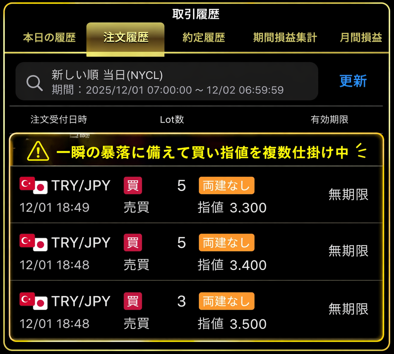 一瞬の暴落を拾えるように指値を仕掛けておきます👇